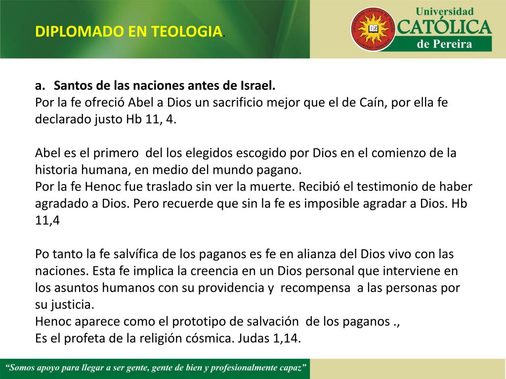DIPLOMADO EN TEOLOGIA. Santos de las naciones antes de Israel. Por la fe ofreció Abel a Dios un sacrificio mejor que el de Caín, por ella fe declarado justo Hb 11, 4. Abel es el primero del los elegidos escogido por Dios en el comienzo de la historia humana, en medio del mundo pagano. Por la fe Henoc fue traslado sin ver la muerte. Recibió el testimonio de haber agradado a Dios. Pero recuerde que sin la fe es imposible agradar a Dios. Hb 11,4 Po tanto la fe salvífica de los paganos es fe en alianza del Dios vivo con las naciones. Esta fe implica la creencia en un Dios personal que interviene en los asuntos humanos con su providencia y recompensa a las personas por su justicia. Henoc aparece como el prototipo de salvación de los paganos ., Es el profeta de la religión cósmica. Judas 1,14.