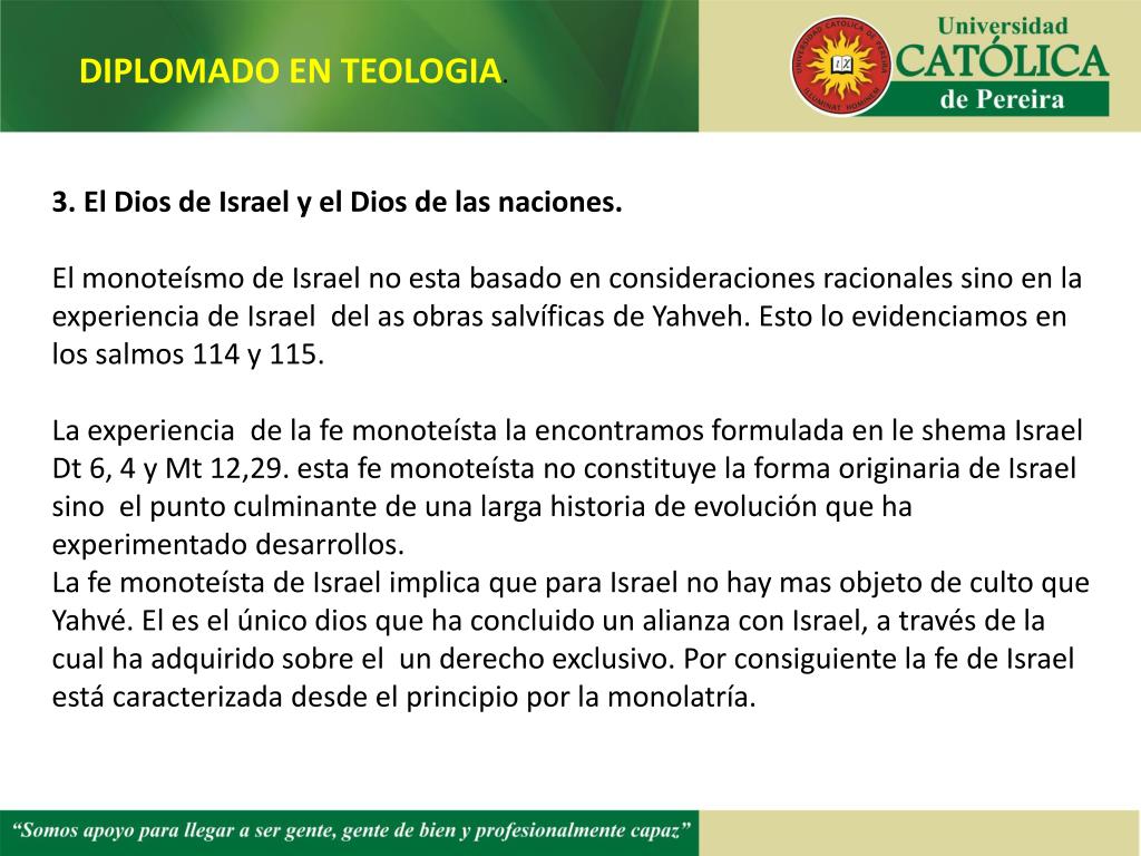 DIPLOMADO EN TEOLOGIA. 3. El Dios de Israel y el Dios de las naciones. El monoteísmo de Israel no esta basado en consideraciones racionales sino en la experiencia de Israel del as obras salvíficas de Yahveh. Esto lo evidenciamos en los salmos 114 y 115. La experiencia de la fe monoteísta la encontramos formulada en le shema Israel Dt 6, 4 y Mt 12,29. esta fe monoteísta no constituye la forma originaria de Israel sino el punto culminante de una larga historia de evolución que ha experimentado desarrollos. La fe monoteísta de Israel implica que para Israel no hay mas objeto de culto que Yahvé. El es el único dios que ha concluido un alianza con Israel, a través de la cual ha adquirido sobre el un derecho exclusivo. Por consiguiente la fe de Israel está caracterizada desde el principio por la monolatría.