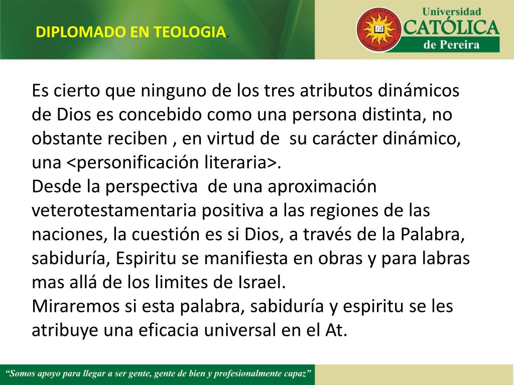 DIPLOMADO EN TEOLOGIA. Es cierto que ninguno de los tres atributos dinámicos de Dios es concebido como una persona distinta, no obstante reciben , en virtud de su carácter dinámico, una <personificación literaria>. Desde la perspectiva de una aproximación veterotestamentaria positiva a las regiones de las naciones, la cuestión es si Dios, a través de la Palabra, sabiduría, Espiritu se manifiesta en obras y para labras mas allá de los limites de Israel. Miraremos si esta palabra, sabiduría y espiritu se les atribuye una eficacia universal en el At.