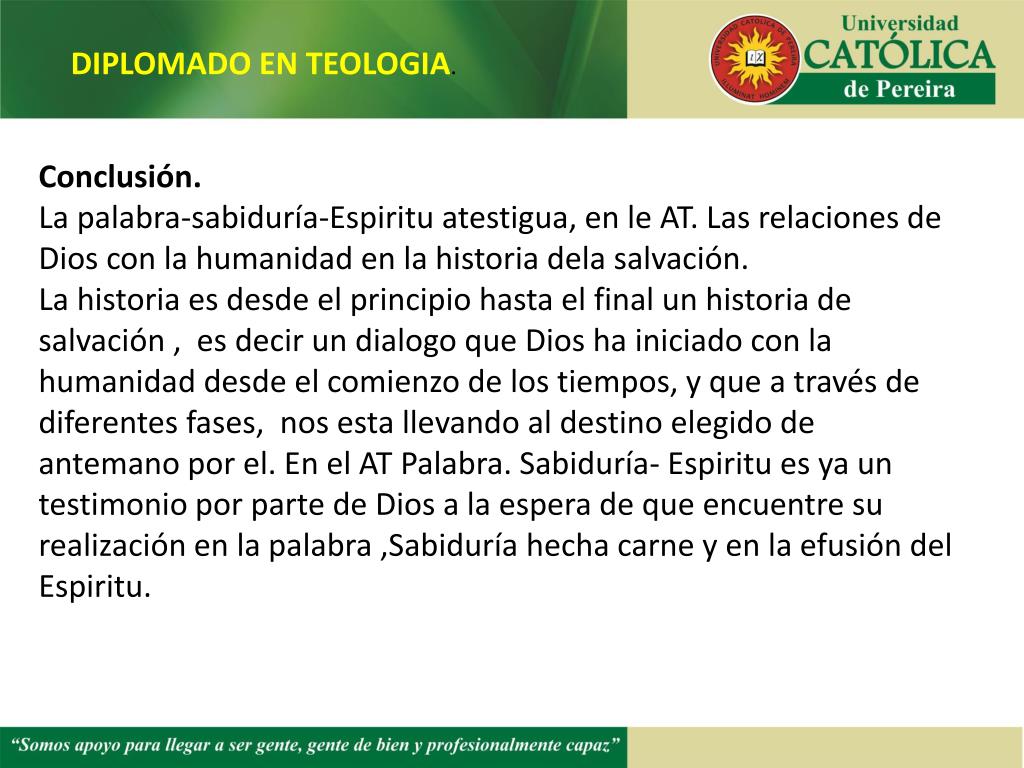 DIPLOMADO EN TEOLOGIA. Conclusión. La palabra-sabiduría-Espiritu atestigua, en le AT. Las relaciones de Dios con la humanidad en la historia dela salvación. La historia es desde el principio hasta el final un historia de salvación , es decir un dialogo que Dios ha iniciado con la humanidad desde el comienzo de los tiempos, y que a través de diferentes fases, nos esta llevando al destino elegido de antemano por el. En el AT Palabra. Sabiduría- Espiritu es ya un testimonio por parte de Dios a la espera de que encuentre su realización en la palabra ,Sabiduría hecha carne y en la efusión del Espiritu.