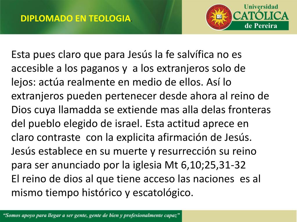 DIPLOMADO EN TEOLOGIA. Esta pues claro que para Jesús la fe salvífica no es accesible a los paganos y a los extranjeros solo de lejos: actúa realmente en medio de ellos. Así lo extranjeros pueden pertenecer desde ahora al reino de Dios cuya llamadda se extiende mas alla delas fronteras del pueblo elegido de israel. Esta actitud aprece en claro contraste con la explicita afirmación de Jesús. Jesús establece en su muerte y resurrección su reino para ser anunciado por la iglesia Mt 6,10;25,31-32 El reino de dios al que tiene acceso las naciones es al mismo tiempo histórico y escatológico.