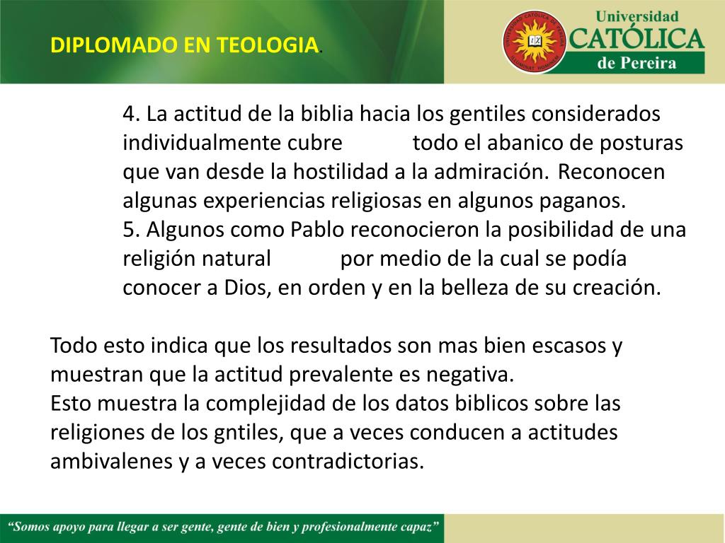DIPLOMADO EN TEOLOGIA. 4. La actitud de la biblia hacia los gentiles considerados individualmente cubre todo el abanico de posturas que van desde la hostilidad a la admiración. Reconocen algunas experiencias religiosas en algunos paganos. 5. Algunos como Pablo reconocieron la posibilidad de una religión natural por medio de la cual se podía conocer a Dios, en orden y en la belleza de su creación. Todo esto indica que los resultados son mas bien escasos y muestran que la actitud prevalente es negativa. Esto muestra la complejidad de los datos biblicos sobre las religiones de los gntiles, que a veces conducen a actitudes ambivalenes y a veces contradictorias.