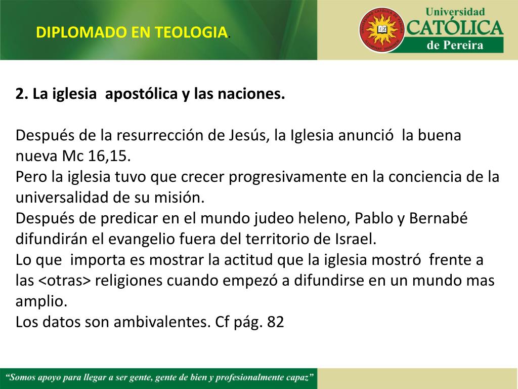 DIPLOMADO EN TEOLOGIA. 2. La iglesia apostólica y las naciones. Después de la resurrección de Jesús, la Iglesia anunció la buena nueva Mc 16,15. Pero la iglesia tuvo que crecer progresivamente en la conciencia de la universalidad de su misión. Después de predicar en el mundo judeo heleno, Pablo y Bernabé difundirán el evangelio fuera del territorio de Israel. Lo que importa es mostrar la actitud que la iglesia mostró frente a las <otras> religiones cuando empezó a difundirse en un mundo mas amplio. Los datos son ambivalentes. Cf pág. 82