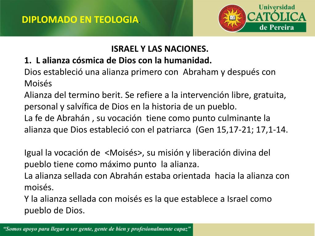 DIPLOMADO EN TEOLOGIA. ISRAEL Y LAS NACIONES. L alianza cósmica de Dios con la humanidad. Dios estableció una alianza primero con Abraham y después con Moisés Alianza del termino berit. Se refiere a la intervención libre, gratuita, personal y salvífica de Dios en la historia de un pueblo. La fe de Abrahán , su vocación tiene como punto culminante la alianza que Dios estableció con el patriarca (Gen 15,17-21; 17,1-14. Igual la vocación de <Moisés>, su misión y liberación divina del pueblo tiene como máximo punto la alianza. La alianza sellada con Abrahán estaba orientada hacia la alianza con moisés. Y la alianza sellada con moisés es la que establece a Israel como pueblo de Dios.