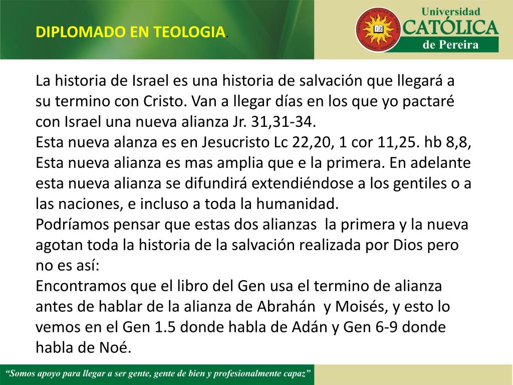 DIPLOMADO EN TEOLOGIA. La historia de Israel es una historia de salvación que llegará a su termino con Cristo. Van a llegar días en los que yo pactaré con Israel una nueva alianza Jr. 31,31-34. Esta nueva alanza es en Jesucristo Lc 22,20, 1 cor 11,25. hb 8,8, Esta nueva alianza es mas amplia que e la primera. En adelante esta nueva alianza se difundirá extendiéndose a los gentiles o a las naciones, e incluso a toda la humanidad. Podríamos pensar que estas dos alianzas la primera y la nueva agotan toda la historia de la salvación realizada por Dios pero no es así: Encontramos que el libro del Gen usa el termino de alianza antes de hablar de la alianza de Abrahán y Moisés, y esto lo vemos en el Gen 1.5 donde habla de Adán y Gen 6-9 donde habla de Noé.
