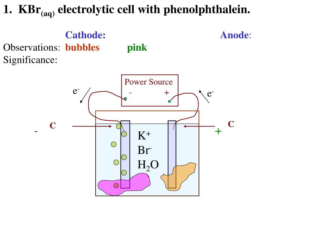 1. KBr(aq) electrolytic cell with phenolphthalein. . Cathode: Anode: Observations: Significance: Power Source - + e- e- C C - + K+ Br- H2O