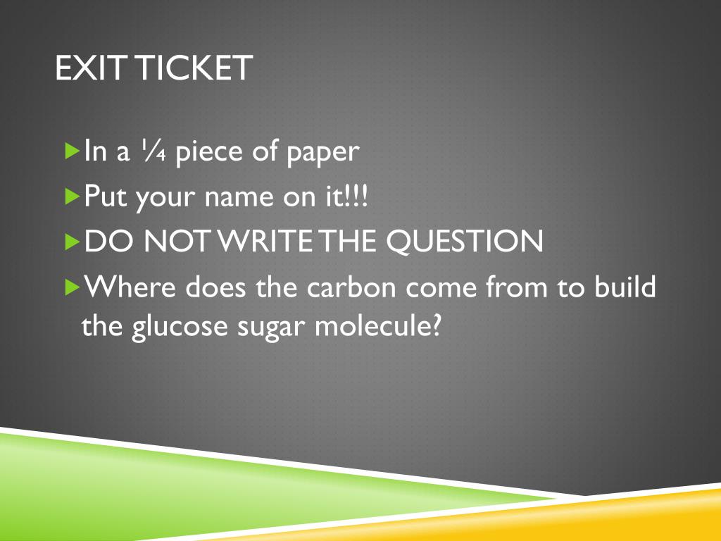 Exit ticket • In a ¼ piece of paper • Put your name on it!!! • DO NOT WRITE THE QUESTION • Where does the carbon come from to build the glucose sugar molecule?