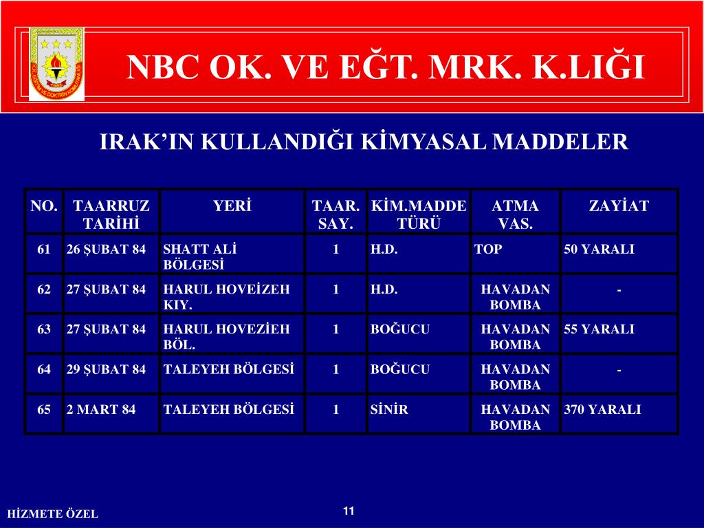 İran-Irak savaşı 1980-84 DEVRESİ İÇİNDEKİ KİMYASAL HARP MADDESİ ZAYİATI 29 Bölgede Sinir Gazı : 40 Şehit, 468 Yaralı 33 Bölgede Yakıcı Gaz : 4 Şehit, 2600 Yaralı 2 Bölgede Boğucu Gaz : 55 Yaralı 1 Bölgede Kusturucu Gaz : - Toplam : 65 Bölgede 44 Şehit, 3123 Yaralı