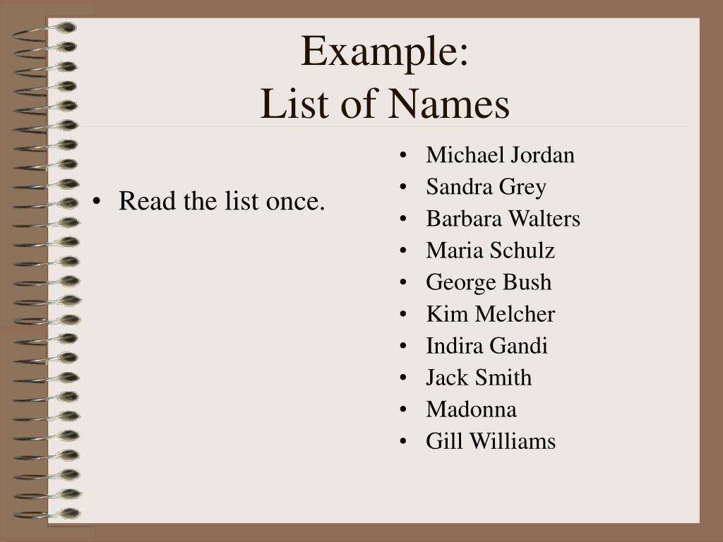 Read the list once. Michael Jordan Sandra Grey Barbara Walters Maria Schulz George Bush Kim Melcher Indira Gandi Jack Smith Madonna Gill Williams Example:List of Names