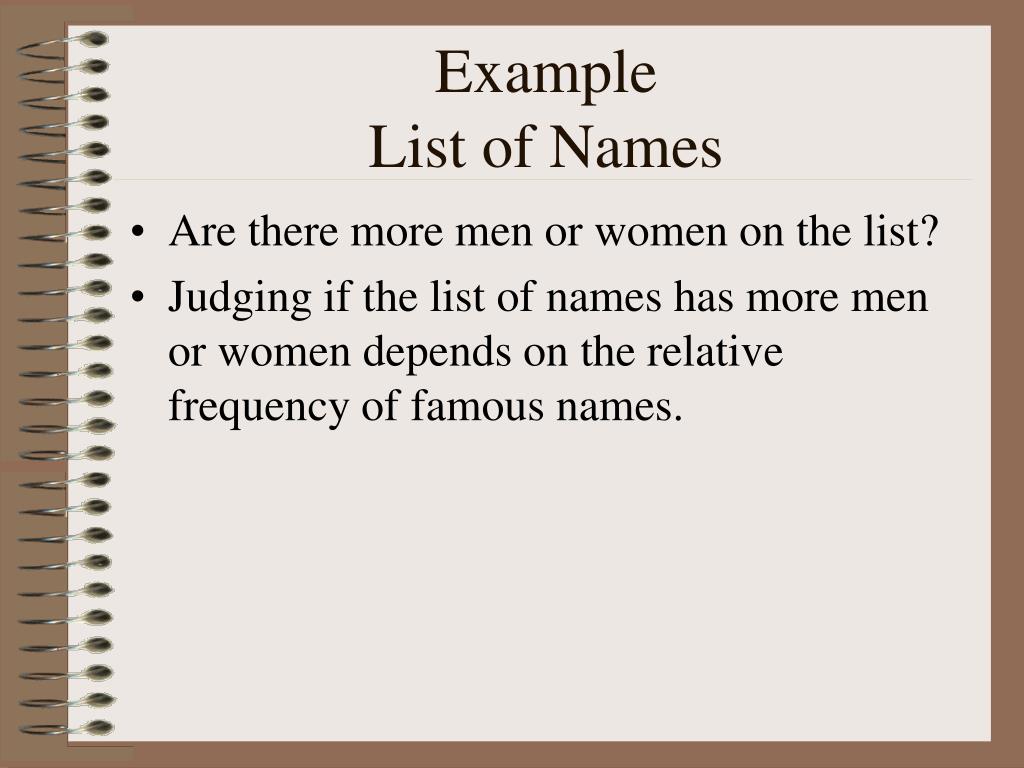 ExampleList of Names • Are there more men or women on the list? • Judging if the list of names has more men or women depends on the relative frequency of famous names.