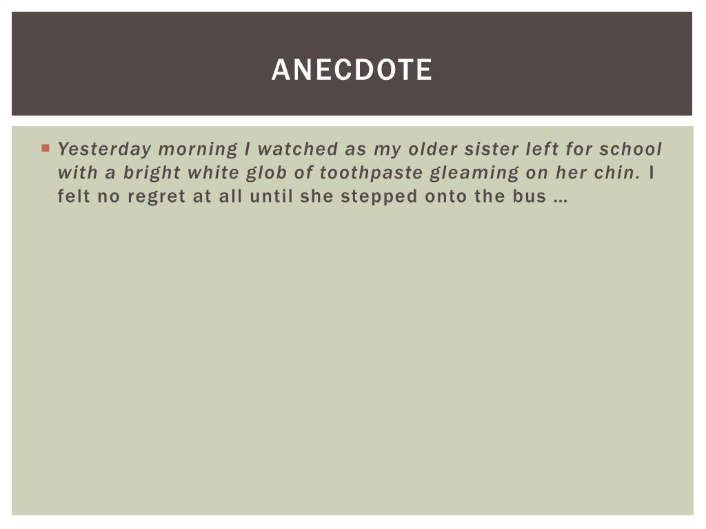Anecdote • Yesterday morning I watched as my older sister left for school with a bright white glob of toothpaste gleaming on her chin. I felt no regret at all until she stepped onto the bus …
