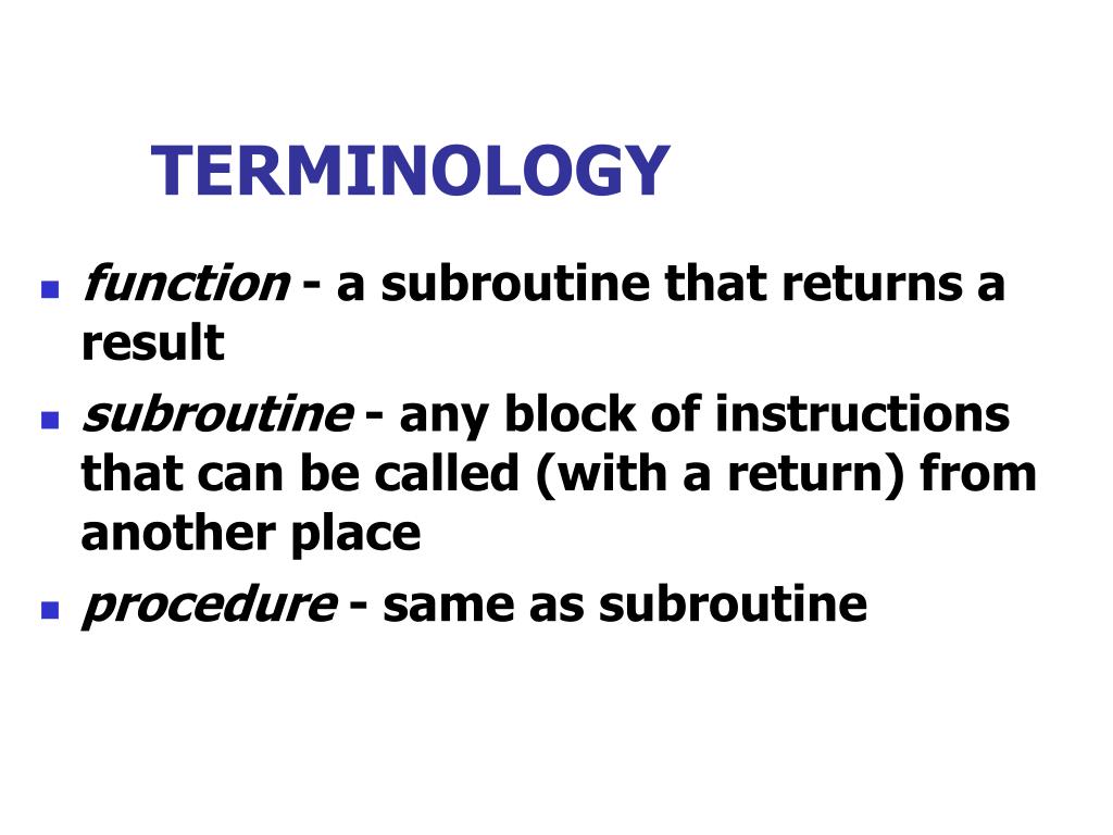 TERMINOLOGY • function - a subroutine that returns a result • subroutine - any block of instructions that can be called (with a return) from another place • procedure - same as subroutine