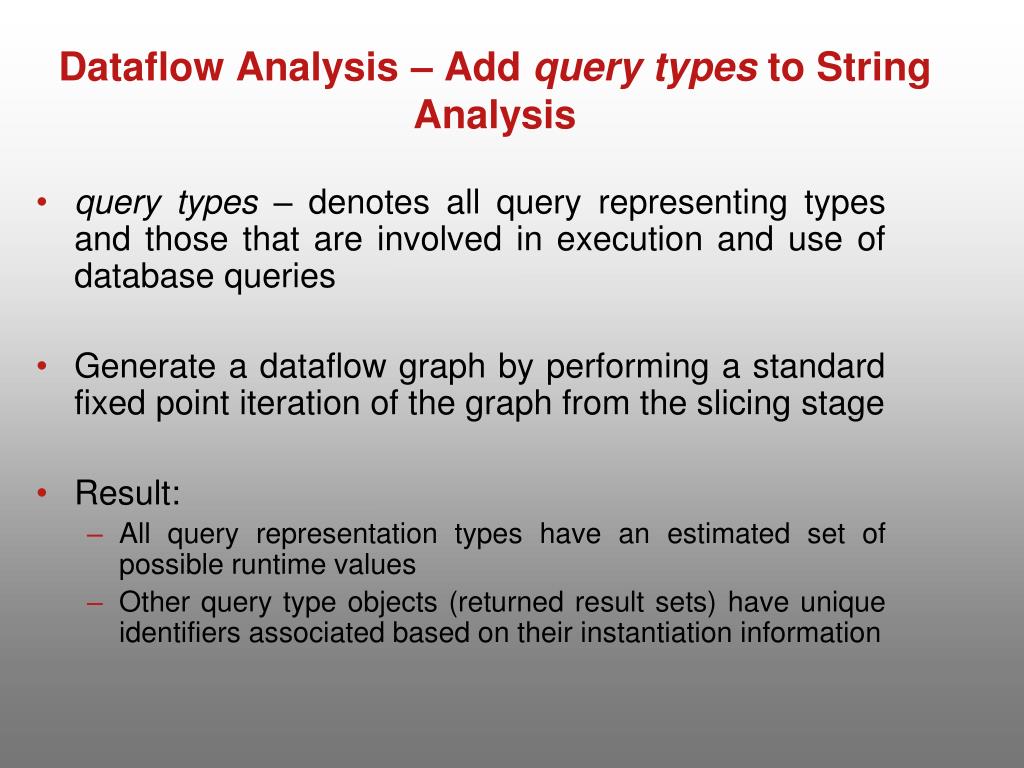 Dataflow Analysis – Add query types to String Analysis • query types – denotes all query representing types and those that are involved in execution and use of database queries • Generate a dataflow graph by performing a standard fixed point iteration of the graph from the slicing stage • Result: • All query representation types have an estimated set of possible runtime values • Other query type objects (returned result sets) have unique identifiers associated based on their instantiation information