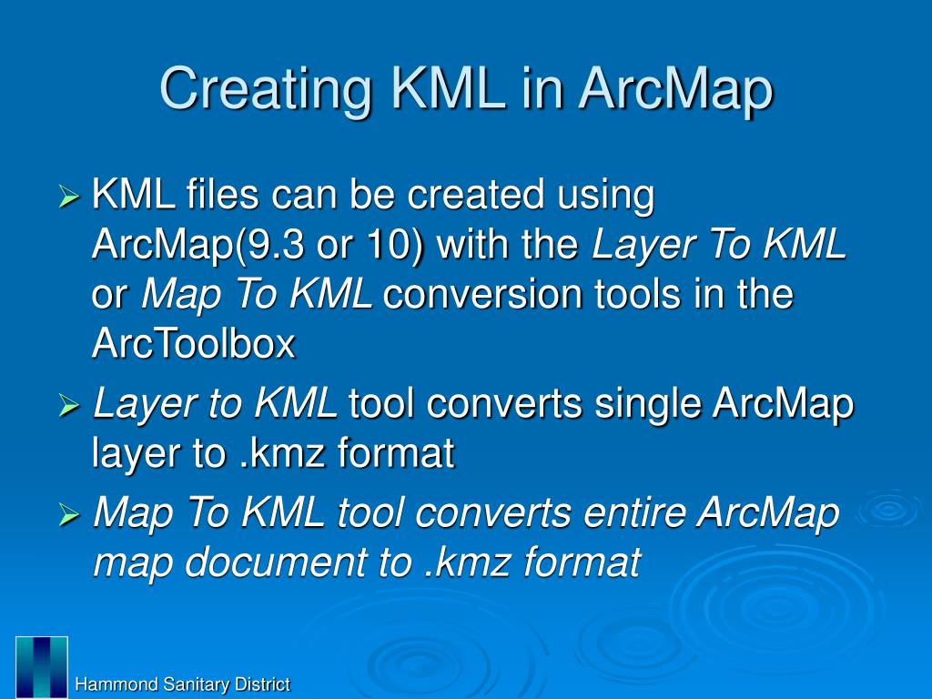 Creating KML in ArcMap • KML files can be created using ArcMap(9.3 or 10) with the Layer To KML or Map To KML conversiontools in the ArcToolbox • Layer to KML tool converts single ArcMap layer to .kmz format • Map To KML tool converts entire ArcMap map document to .kmz format Hammond Sanitary District