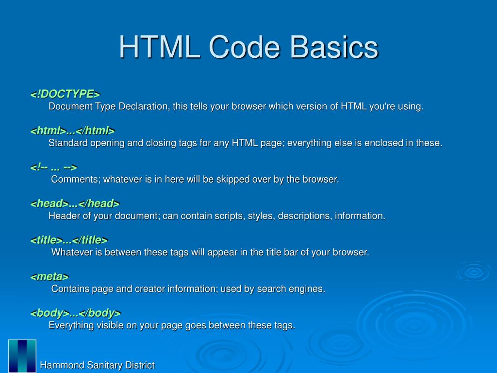 HTML Code Basics <!DOCTYPE> Document Type Declaration, this tells your browser which version of HTML you're using. <html>...</html> Standard opening and closing tags for any HTML page; everything else is enclosed in these. <!-- ... --> Comments; whatever is in here will be skipped over by the browser. <head>...</head> Header of your document; can contain scripts, styles, descriptions, information. <title>...</title> Whatever is between these tags will appear in the title bar of your browser. <meta> Contains page and creator information; used by search engines. <body>...</body> Everything visible on your page goes between these tags. Hammond Sanitary District