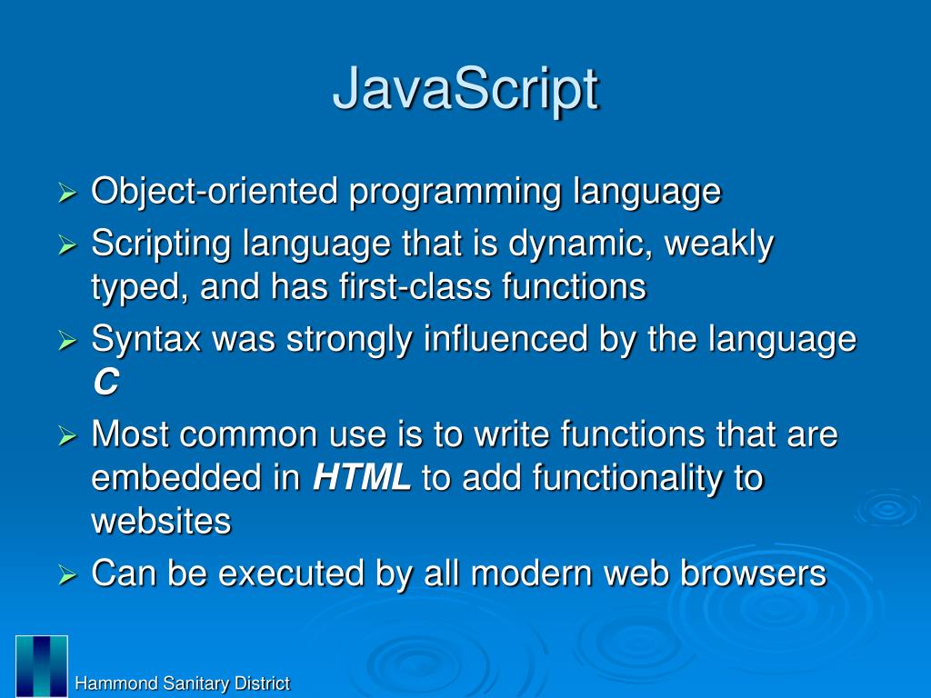 JavaScript • Object-oriented programming language • Scripting language that is dynamic, weakly typed, and has first-class functions • Syntax was strongly influenced by the language C • Most common use is to write functions that are embedded in HTML to add functionality to websites • Can be executed by all modern web browsers Hammond Sanitary District