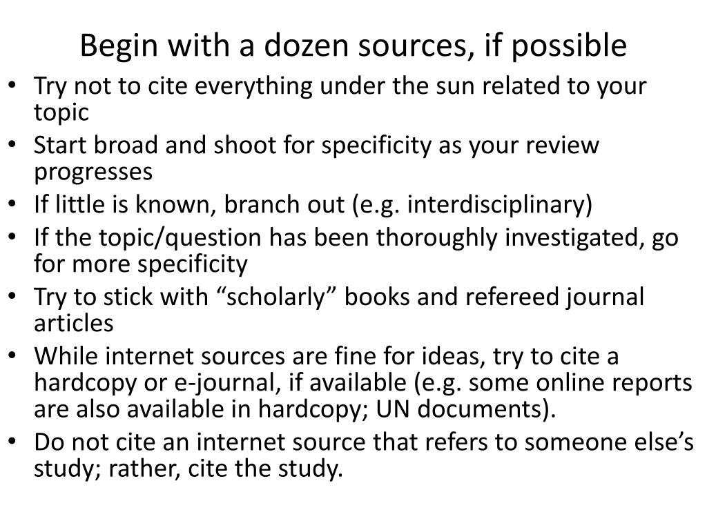 Begin with a dozen sources, if possible • Try not to cite everything under the sun related to your topic • Start broad and shoot for specificity as your review progresses • If little is known, branch out (e.g. interdisciplinary) • If the topic/question has been thoroughly investigated, go for more specificity • Try to stick with “scholarly” books and refereed journal articles • While internet sources are fine for ideas, try to cite a hardcopy or e-journal, if available (e.g. some online reports are also available in hardcopy; UN documents). • Do not cite an internet source that refers to someone else’s study; rather, cite the study.