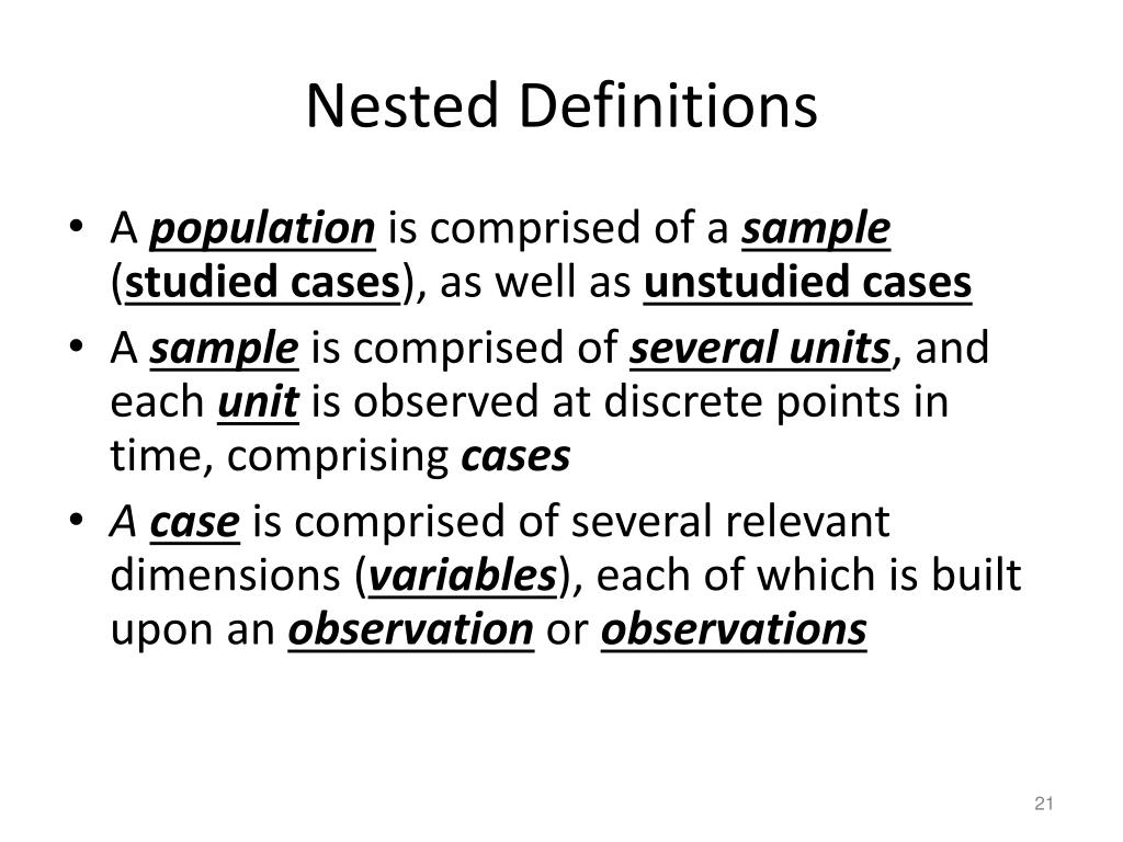 Nested Definitions • A population is comprised of a sample (studied cases), as well as unstudiedcases • A sample is comprised of several units, and each unit is observed at discrete points in time, comprising cases • A case is comprised of several relevant dimensions (variables), each of which is built upon an observation or observations
