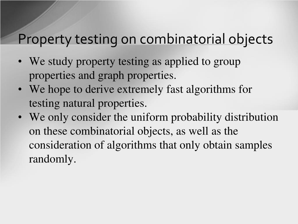 Property testing on combinatorial objects • We study property testing as applied to group properties and graph properties. • We hope to derive extremely fast algorithms for testing natural properties. • We only consider the uniform probability distribution on these combinatorial objects, as well as the consideration of algorithms that only obtain samples randomly.