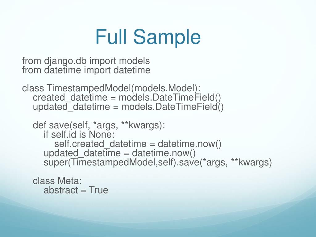 Full Sample from django.db import modelsfrom datetime import datetime class TimestampedModel(models.Model):created_datetime = models.DateTimeField()updated_datetime = models.DateTimeField()def save(self, *args, **kwargs): if self.idis None:self.created_datetime = datetime.now()updated_datetime = datetime.now() super(TimestampedModel,self).save(*args, **kwargs) class Meta: abstract = True
