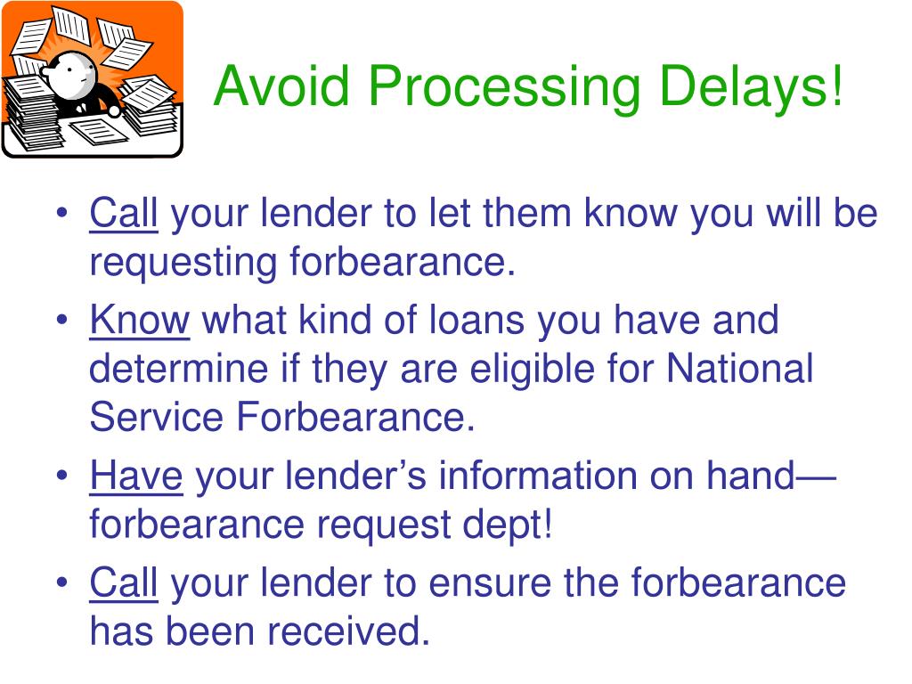 Avoid Processing Delays! • Call your lender to let them know you will be requesting forbearance. • Know what kind of loans you have and determine if they are eligible for National Service Forbearance. • Have your lender’s information on hand—forbearance request dept! • Call your lender to ensure the forbearance has been received.