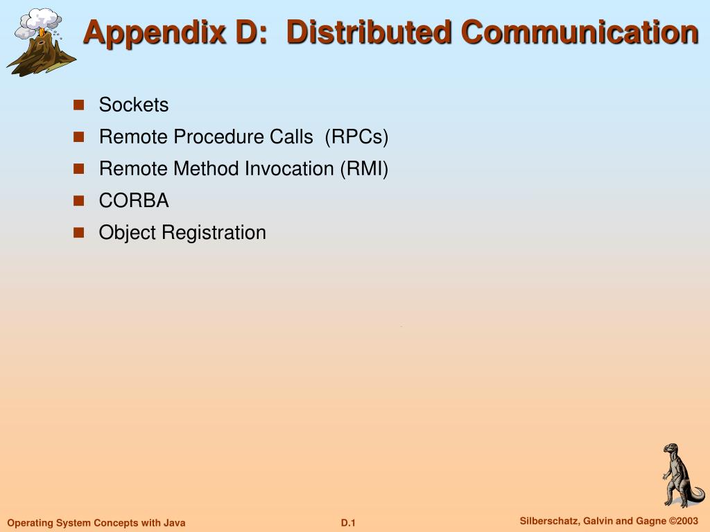 Appendix D: Distributed Communication • Sockets • Remote Procedure Calls (RPCs) • Remote Method Invocation (RMI) • CORBA • Object Registration
