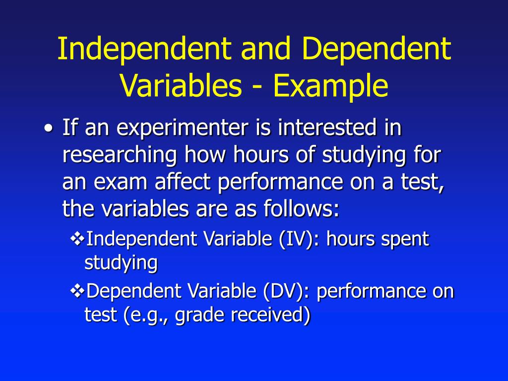 Independent and Dependent Variables - Example • If an experimenter is interested in researching how hours of studying for an exam affect performance on a test, the variables are as follows: • Independent Variable (IV): hours spent studying • Dependent Variable (DV): performance on test (e.g., grade received)