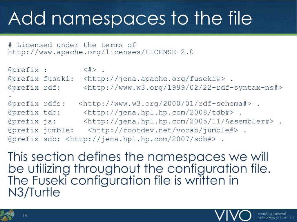Add namespaces to the file # Licensed under the terms of http://www.apache.org/licenses/LICENSE-2.0 @prefix : <#> . @prefix fuseki: <http://jena.apache.org/fuseki#> . @prefix rdf: <http://www.w3.org/1999/02/22-rdf-syntax-ns#> . @prefix rdfs: <http://www.w3.org/2000/01/rdf-schema#> . @prefix tdb: <http://jena.hpl.hp.com/2008/tdb#> . @prefix ja: <http://jena.hpl.hp.com/2005/11/Assembler#> . @prefix jumble: <http://rootdev.net/vocab/jumble#> . @prefix sdb: <http://jena.hpl.hp.com/2007/sdb#> . This section defines the namespaces we will be utilizing throughout the configuration file. The Fuseki configuration file is written in N3/Turtle