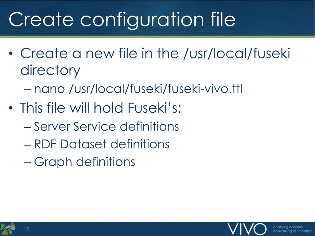 Create configuration file • Create a new file in the /usr/local/fuseki directory • nano /usr/local/fuseki/fuseki-vivo.ttl • This file will hold Fuseki’s: • Server Service definitions • RDF Dataset definitions • Graph definitions