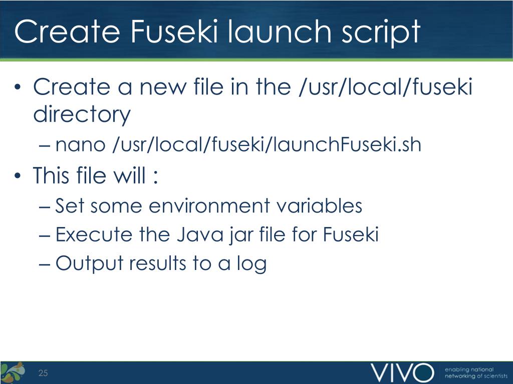 Create Fuseki launch script • Create a new file in the /usr/local/fuseki directory • nano /usr/local/fuseki/launchFuseki.sh • This file will : • Set some environment variables • Execute the Java jar file for Fuseki • Output results to a log