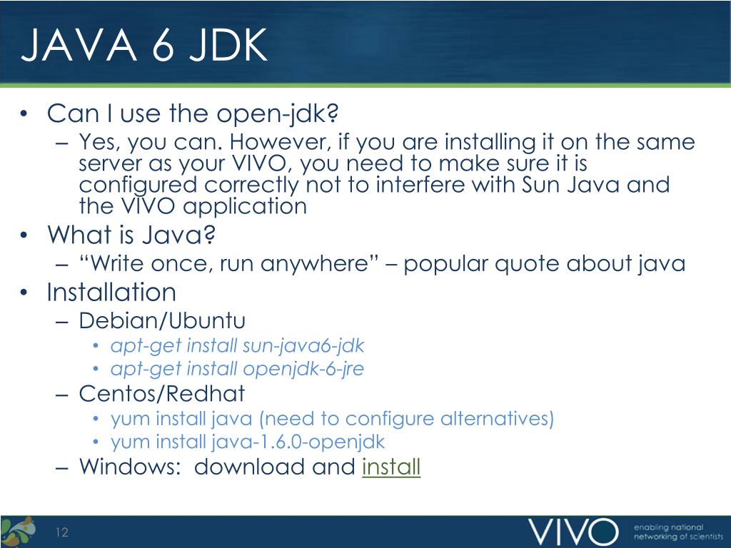 JAVA 6 JDK • Can I use the open-jdk? • Yes, you can. However, if you are installing it on the same server as your VIVO, you need to make sure it is configured correctly not to interfere with Sun Java and the VIVO application • What is Java? • “Write once, run anywhere” – popular quote about java • Installation • Debian/Ubuntu • apt-get install sun-java6-jdk • apt-get install openjdk-6-jre • Centos/Redhat • yum install java (need to configure alternatives) • yum install java-1.6.0-openjdk • Windows: download and install