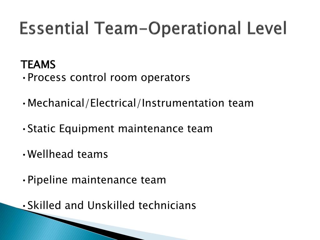 Essential Team-Operational Level TEAMS •Process control room operators •Mechanical/Electrical/Instrumentation team •Static Equipment maintenance team •Wellhead teams •Pipeline maintenance team •Skilled and Unskilled technicians