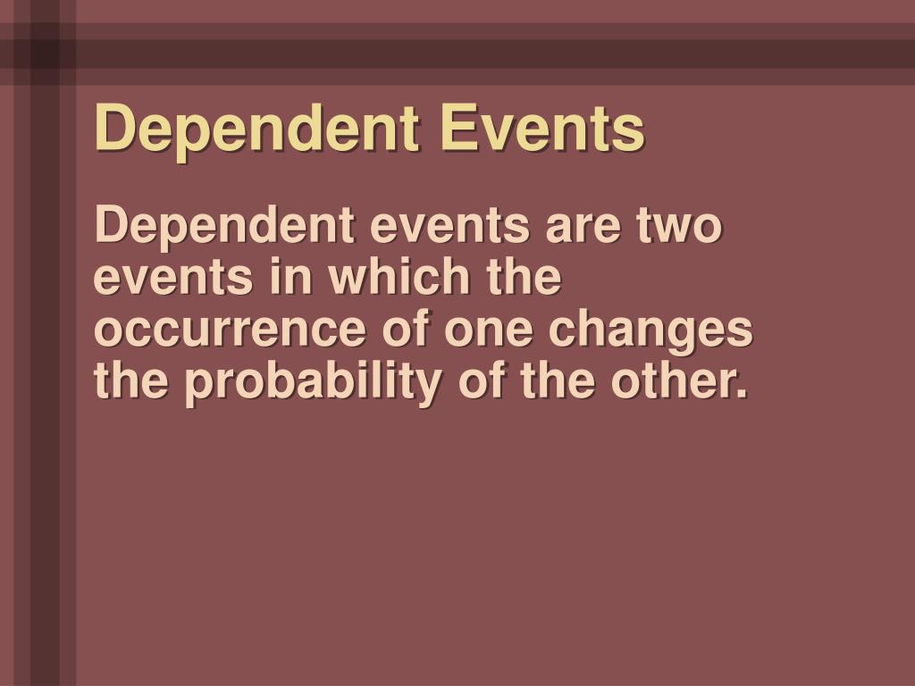 Dependent Events Dependent events are two events in which the occurrence of one changes the probability of the other.