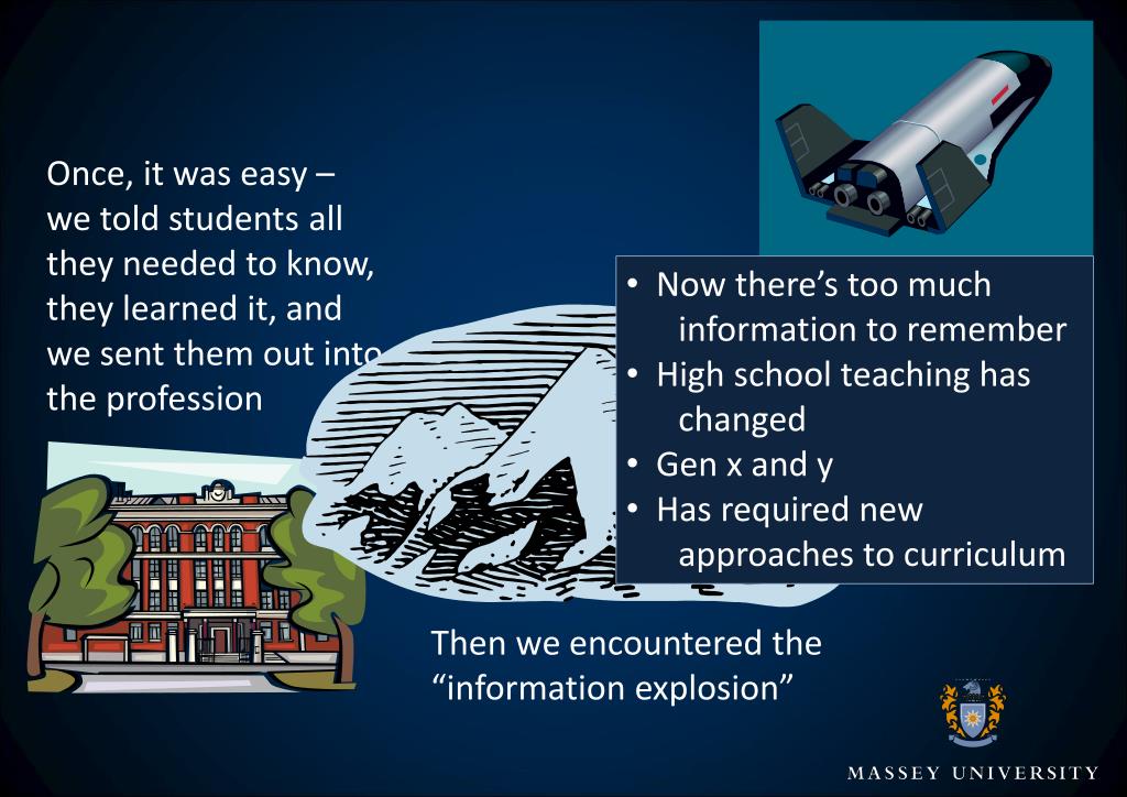 Once, it was easy – we told students all they needed to know, they learned it, and we sent them out into the profession • Now there’s too much information to remember • High school teaching has changed • Gen x and y • Has required new approaches to curriculum Then we encountered the “information explosion”