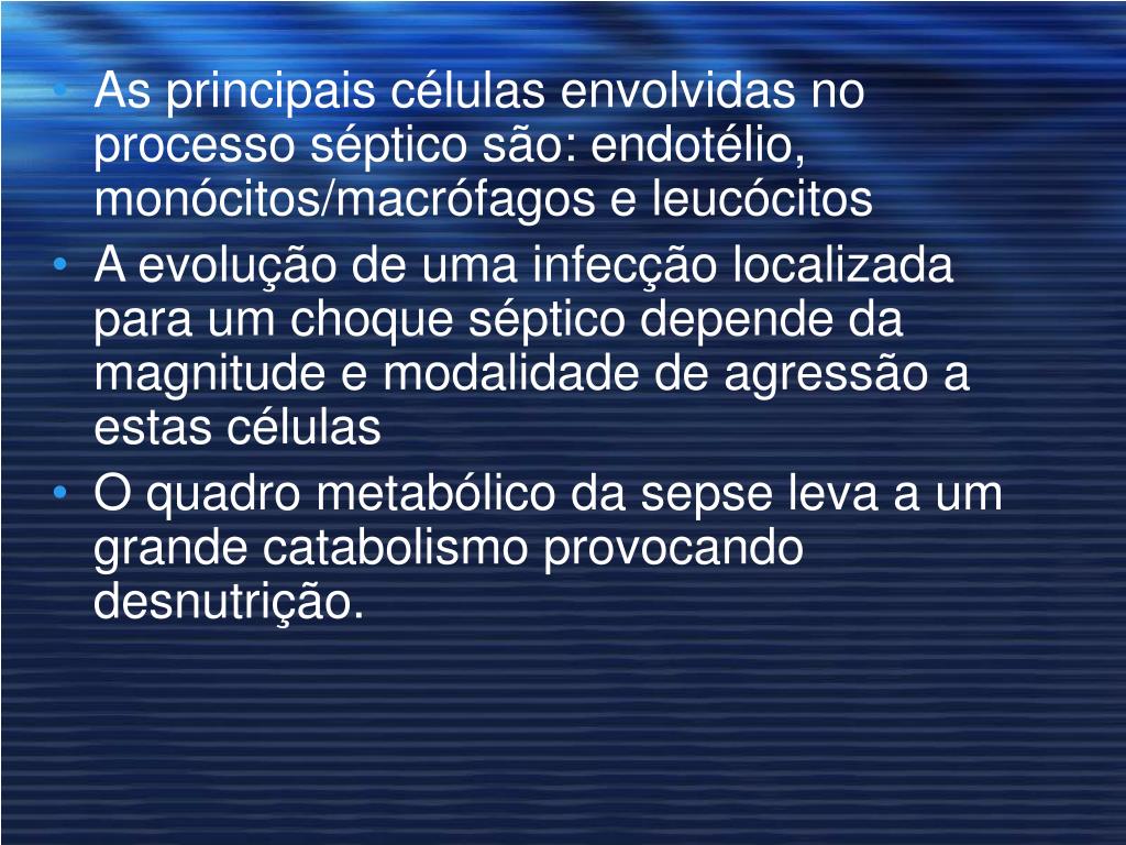 As principais células envolvidas no processo séptico são: endotélio, monócitos/macrófagos e leucócitos • A evolução de uma infecção localizada para um choque séptico depende da magnitude e modalidade de agressão a estas células • O quadro metabólico da sepse leva a um grande catabolismo provocando desnutrição.