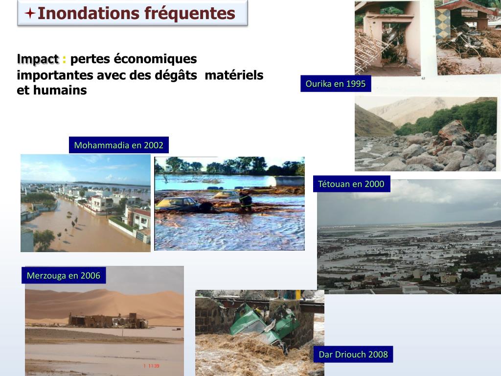 Inondations fréquentes Impact : pertes économiques importantes avec des dégâts matériels et humains Ourika en 1995 Mohammadia en 2002 Tétouan en 2000 Merzouga en 2006 Dar Driouch 2008 1