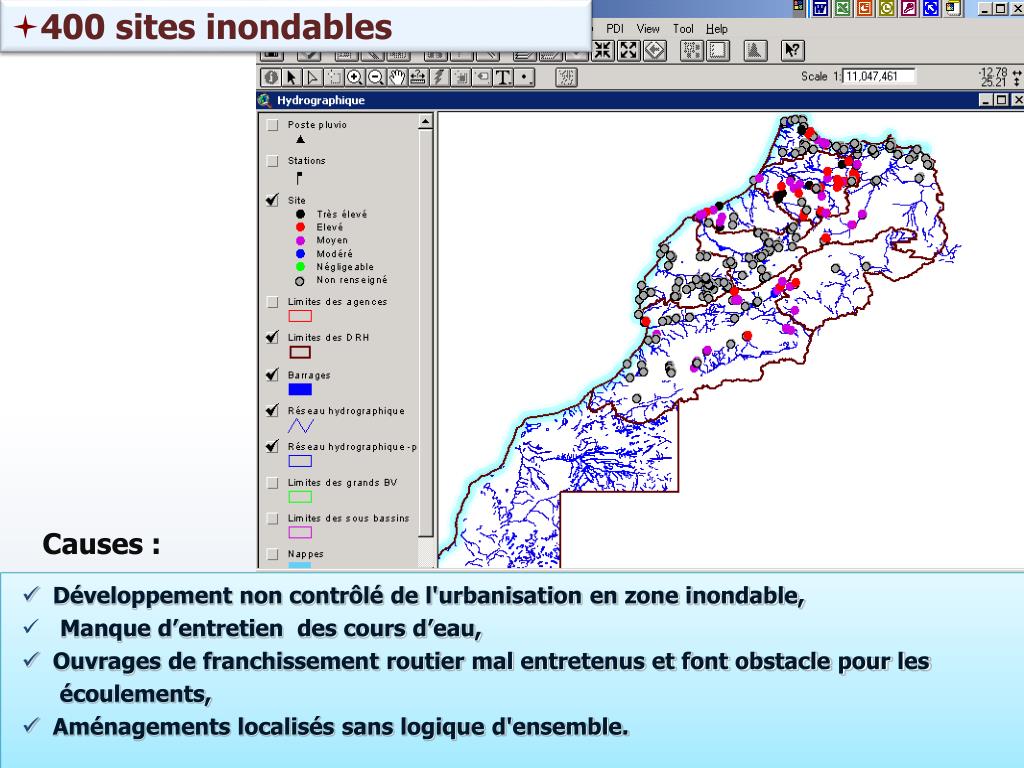 400 sites inondables Causes : • Développement non contrôlé de l'urbanisation en zone inondable, • Manque d’entretien des cours d’eau, • Ouvrages de franchissement routier mal entretenus et font obstacle pour les • écoulements, • Aménagements localisés sans logique d'ensemble.