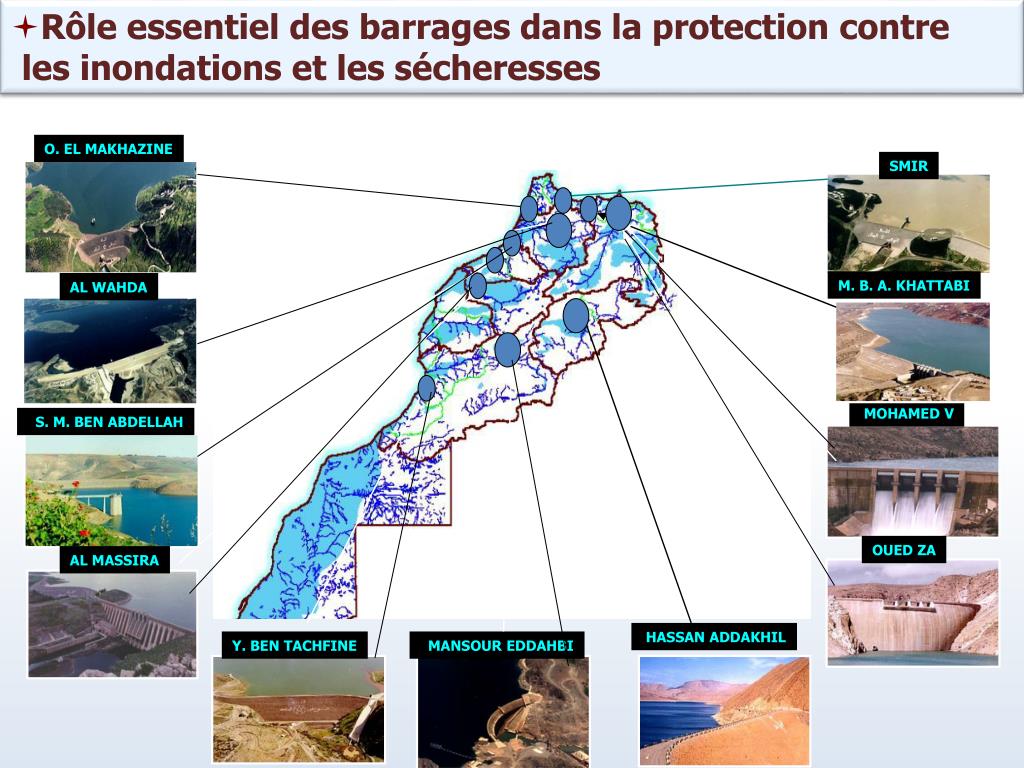 Rôle essentiel des barrages dans la protection contre les inondations et les sécheresses O. EL MAKHAZINE SMIR M. B. A. KHATTABI AL WAHDA MOHAMED V S. M. BEN ABDELLAH OUED ZA AL MASSIRA HASSAN ADDAKHIL Y. BEN TACHFINE MANSOUR EDDAHBI