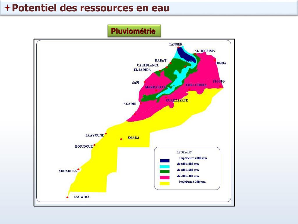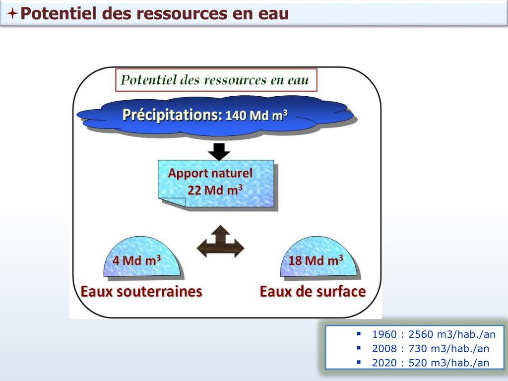 Potentiel des ressources en eau • 1960 : 2560 m3/hab./an • 2008 : 730 m3/hab./an • 2020 : 520 m3/hab./an