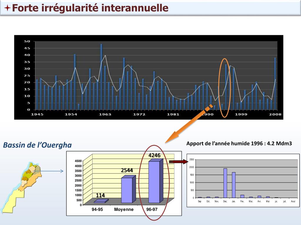 Forte irrégularité interannuelle Bassin de l’Ouergha Apport de l’année humide 1996 : 4.2 Mdm3 4246 2544 114