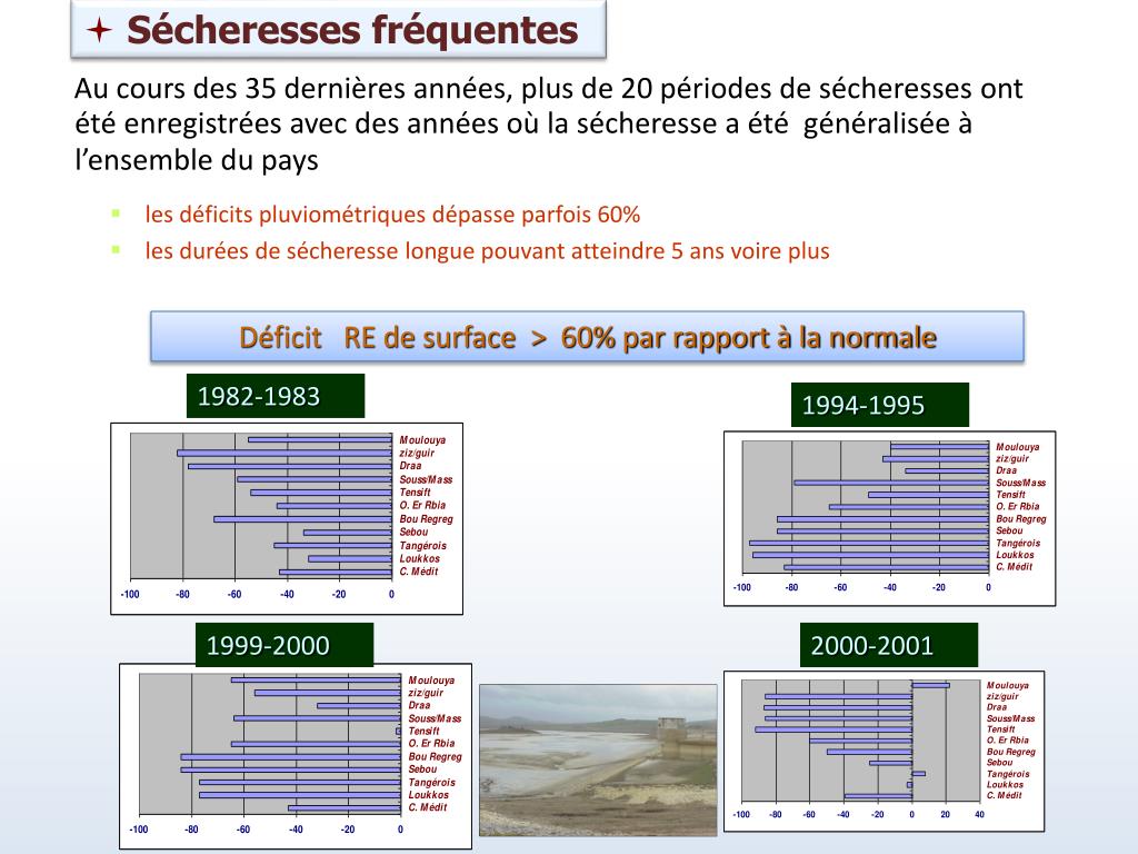 Sécheresses fréquentes Au cours des 35 dernières années, plus de 20 périodes de sécheresses ont été enregistrées avec des années où la sécheresse a été généralisée à l’ensemble du pays • les déficits pluviométriques dépasse parfois 60% • les durées de sécheresse longue pouvant atteindre 5 ans voire plus Déficit RE de surface > 60% par rapport à la normale 1982-1983 1994-1995 1999-2000 2000-2001 1