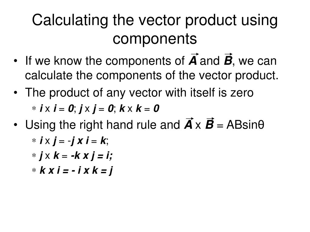 Calculating the vector product using components • If we know the components of A and B, we can calculate the components of the vector product. • The product of any vector with itself is zero • i x i = 0; j x j = 0; k x k = 0 • Using the right hand rule and A x B = ABsinθ • i x j = -j x i = k; • j x k = -k x j = i; • k x i = - i x k = j