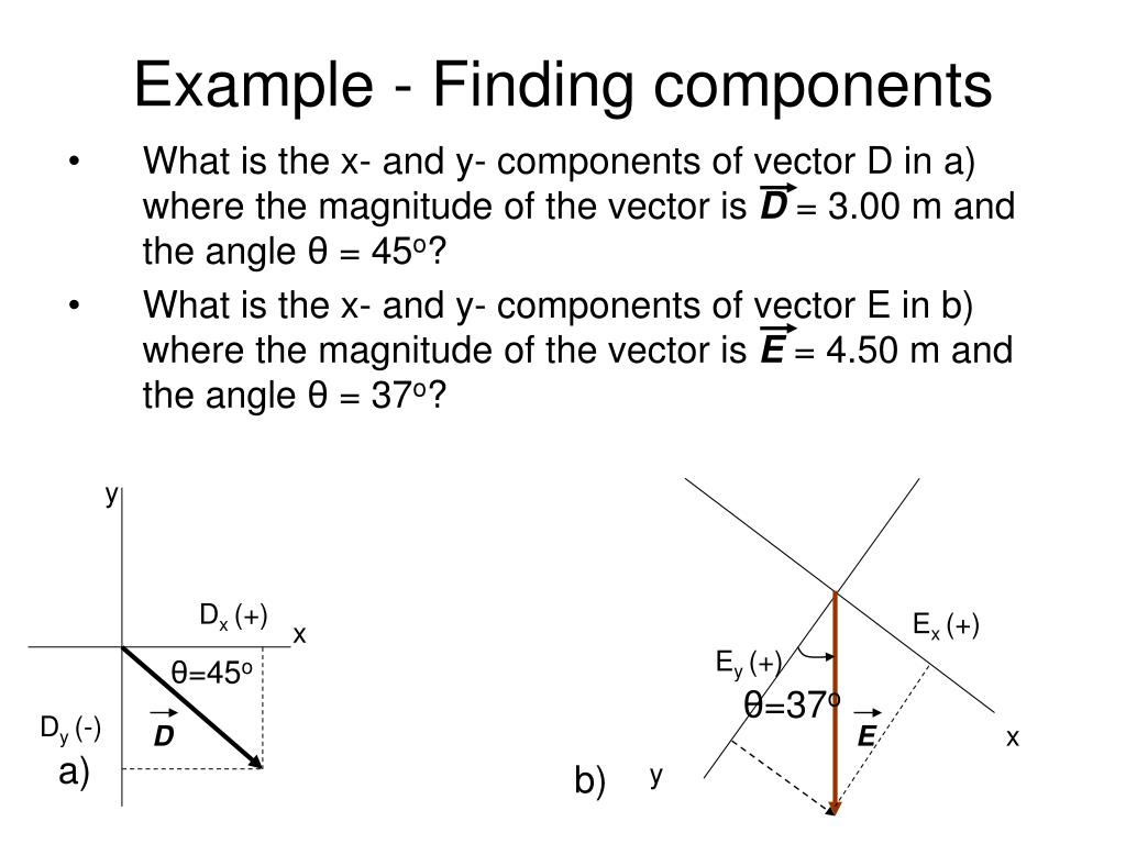 D E Example - Finding components • What is the x- and y- components of vector D in a) where the magnitude of the vector is D = 3.00 m and the angle θ = 45o? • What is the x- and y- components of vector E in b) where the magnitude of the vector is E = 4.50 m and the angle θ = 37o? y Dx (+) Ex (+) x Ey (+) θ=45o θ=37o Dy (-) x a) b) y