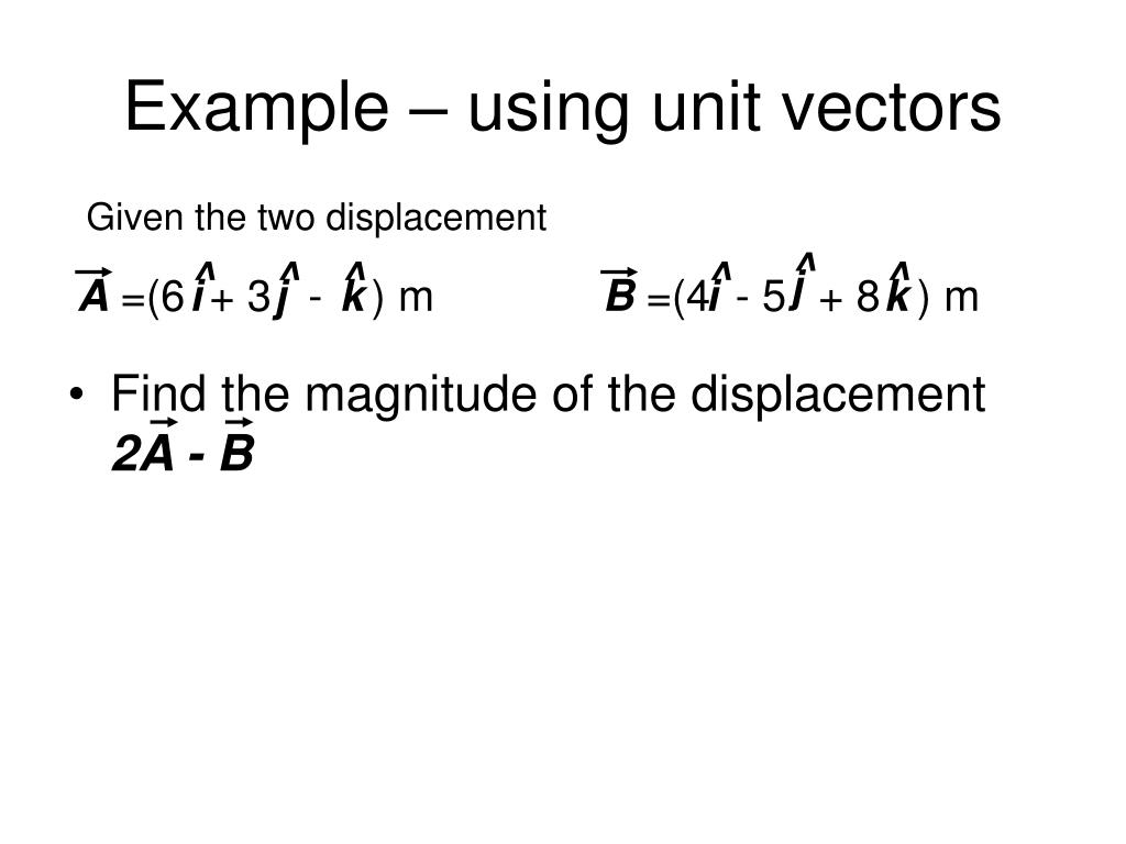 B =(4 - 5+ 8 ) m A =(6 + 3 - ) m • Find the magnitude of the displacement 2A - B ^ ^ ^ ^ ^ ^ i j k i j k Example – using unit vectors Given the two displacement