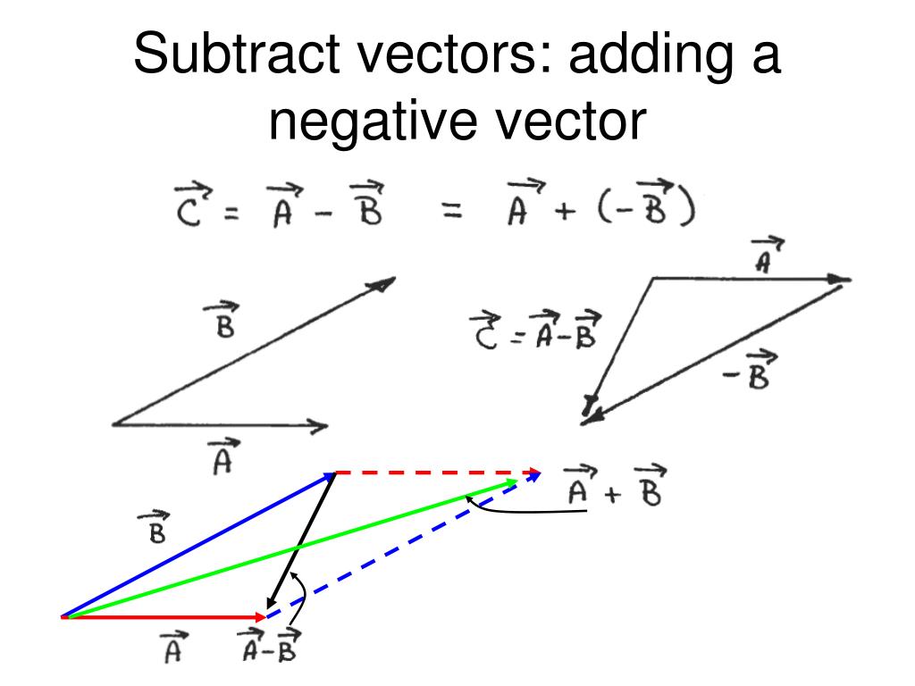 Adding vectors • The sum of two vectors is also a vector. • Graphical method: Vectors are represented by arrows, drawn to scale. Place the tail of the 2nd vector on the head of the 1st, preserving the relative orientations. The resultant vector extends from the tail of the 1st to the head of the 2nd vector. • The sum of two vectors is also a vector. • Addition makes sense only for same kinds of vectors