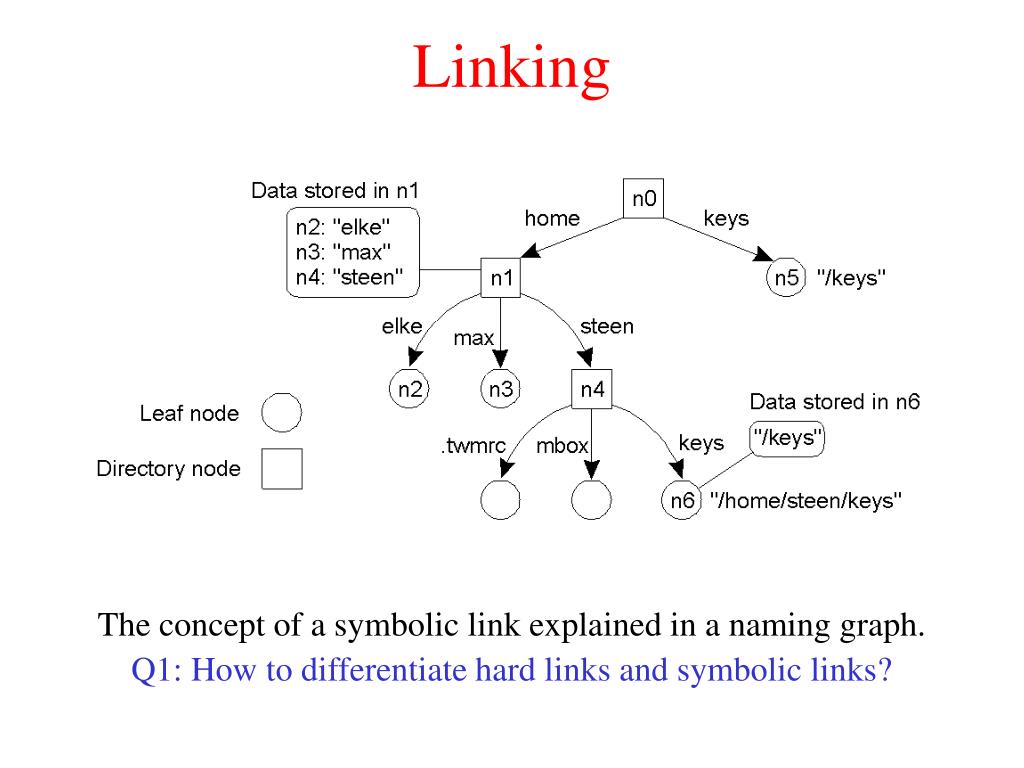 Linking • The concept of a symbolic link explained in a naming graph. • Q1: How to differentiate hard links and symbolic links?