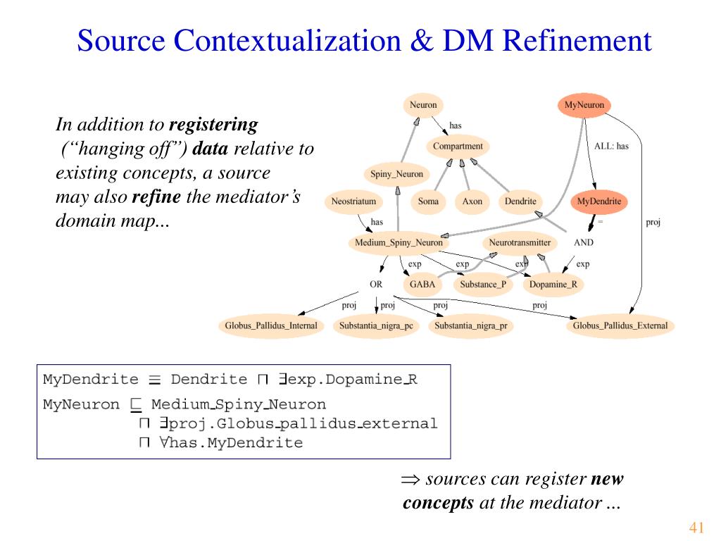 In addition to registering (“hanging off”) data relative to existing concepts, a source may also refine the mediator’s domain map... Source Contextualization & DM Refinement • sources can register new concepts at the mediator ...
