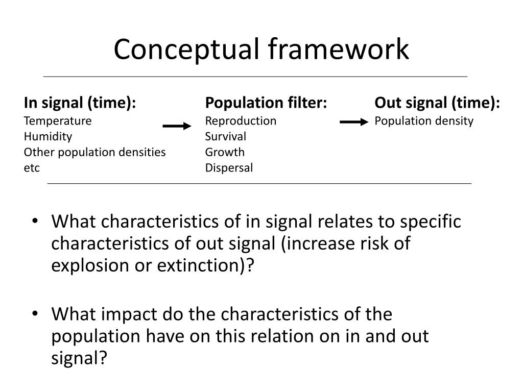 Conceptual frameworkmethodological questions, part I In signal Temperature Humidity Other population densities etc Population filter: Reproduction Survival Growth Dispersal Out signal: Population density Spatial domain and sets of population What defines the characteristics of the signals? What characteristics are important (extinction/explosion)? variance mean autocorrelation/aggregation synchronization