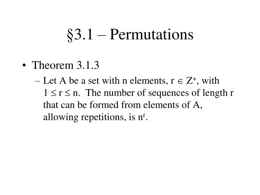 §3.1 – Permutations • Theorem 3.1.3 • Let A be a set with n elements, r Z+, with 1 r n. The number of sequences of length r that can be formed from elements of A, allowing repetitions, is nr.