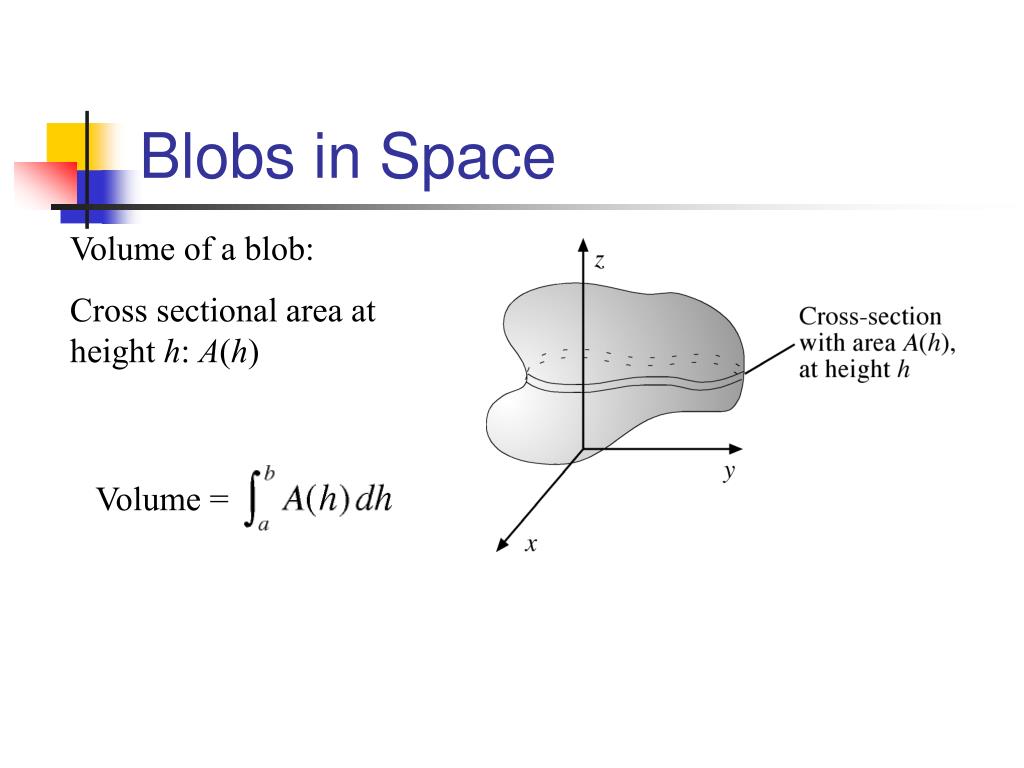 Blobs in Space Volume of a blob: Cross sectional area at height h: A(h) Volume =
